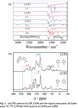 數(shù)據(jù):Fig. 1顯示配體和Ru前驅(qū)體結(jié)構(gòu);Fig. 2a FTIR譜證實(shí)羧酸酯和芳香環(huán)特征峰,F(xiàn)ig. 2b NMR顯示芳香碳和triazine環(huán)信號(hào);Fig. 3a ICP-MS測得Ru含量接近理論值,F(xiàn)ig. 3b TGA表明熱穩(wěn)定性達(dá)150°C。