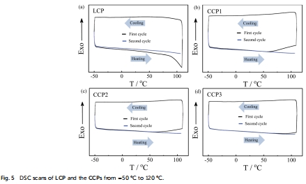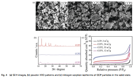 數(shù)據(jù):Fig. 4a SEM顯示納米顆粒(50-200 nm),F(xiàn)ig. 4b XRD表明CCP1半結(jié)晶、CCP2無定形,F(xiàn)ig. 4c BET表面積CCP2最高(55 m2/g);Fig. 5 DSC無相變。
