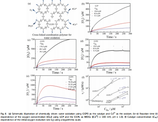 數(shù)據(jù):Fig. 6b-e顯示氧氣產(chǎn)生隨時(shí)間變化,F(xiàn)ig. 6f初始速率v_i與Ru濃度呈準(zhǔn)一級(jí)關(guān)系(指數(shù)α~1);Fig. 7a TOF/TON值CCP3最佳(TOF~0.85 s?1),F(xiàn)ig. 7c-d接觸角越?。ㄓH水性越強(qiáng)),活性越高。