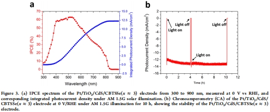 研究意義:高IPCE表明器件在可見光區高效利用光子;穩定性測試證明TiO?層有效防止光腐蝕,優于傳統CIGS/CZTS光陰極。