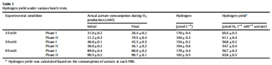數據:Fig. 3a顯示35 mM乙酸下產氫達170 μmol L?1(Phase I),補充乙酸后重復產氫(Phase II);Table 1顯示產氫得率(~65 μmol H? L?1 mM?1乙酸)與乙酸濃度無關。