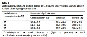 數據:產氫后生物質含碳水化合物52-58%、脂質12-17%、蛋白質29-31%,乙酸濃度略提高脂質含量。
