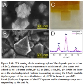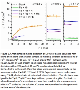 數據:在pH 9.2下,CV顯示預波峰(Mn氧化),但OER電流低(Figure 1A);CA顯示電流衰減(Figure 1B)。在pH 2.9下,Luina水樣CA電流增長至6.0-6.3 mA cm?2(Figure 1C);人工水樣中Fe+Pb組合電流達4.7 mA cm?2(η=0.8 V)(Figure 3)。