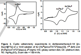 數據:在DCM中,1???的Ru???/??電位E?/?=0.31 V;2??的Ru??/???和Ru???/??電位分別為1.32 V和1.05 V。在水溶液(pH 7)中,2??的Ru??/???和Ru???/??電位分別為1.23 V和0.89 V。