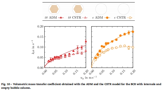 研究意義:內部構件阻尼湍流,降低kL;但小管徑配置(如t8)因高界面面積部分補償kLa損失。ADM比CSTR模型更準確(Fig. 10),凸顯背混影響。
