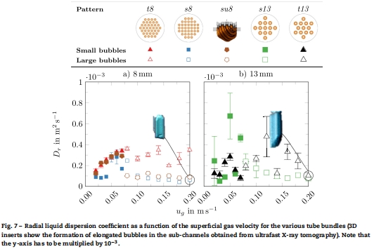 研究意義:內部構件抑制徑向混合,導致子通道內液體滯留;三角形排列和小管徑(如t8)增強軸向分散 due to 高流阻和壁區氣泡上升。數據驗證2D模型必要性,避免ADM的過度簡化。