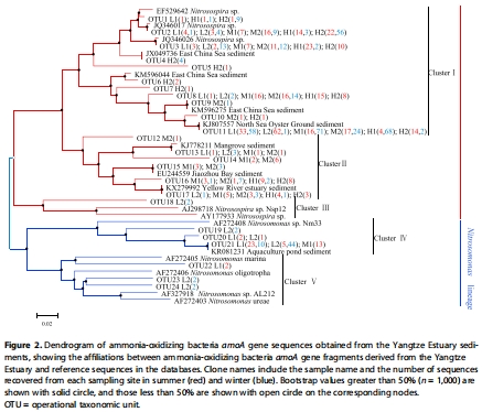 數據:AOB和AOA的Shannon指數分別為0.07-2.11和0.20-2.69,AOB多樣性季節性變化顯著(P=0.045),AOA在高鹽度區域更豐富。