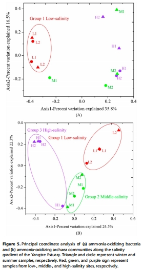 數據:主坐標分析顯示AOB和AOA群落沿鹽度梯度分簇,低、中、高鹽度站點各自聚集。
