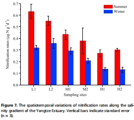 數據:硝化速率夏季(0.43 μg N·g?1·day?1)高于冬季(0.24 μg N·g?1·day?1),且與鹽度負相關(R=-0.711, P=0.001)。