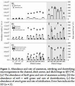 數(shù)據(jù):Anammox細(xì)菌豐度在溝渠邊緣最高(3.82×10^7 copies/g),速率達(dá)339.4 nmol N/cm2/d;反硝化和硝化速率也最高在邊緣(反硝化449.6 nmol N/cm2/d,硝化424.6 nmol N/cm2/d)。