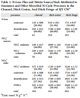 數(shù)據(jù):在溝渠邊緣,anammox貢獻(xiàn)43.0%氮損失和44.4%銨去除;亞硝酸鹽來源中,銨氧化占55.8%,硝酸鹽還原占44.2%。