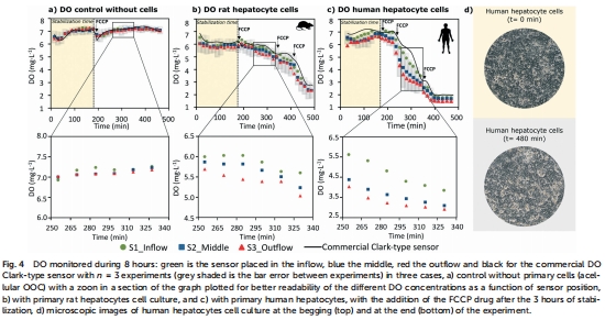 系統集成:將三個傳感器集成于ExoLiver生物反應器的多孔膜上,沿微流體通道分布(流入、中間、流出點),與細胞培養區域直接接觸(Fig. 3)。系統包括上通道(流動培養基)和下通道(靜態肝細胞培養)。