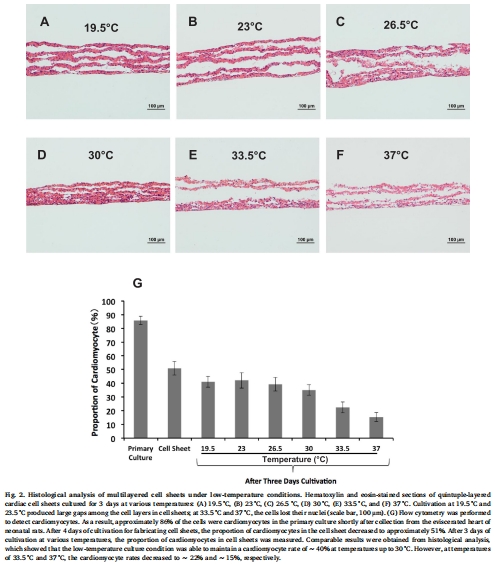 數(shù)據(jù):H&E染色顯示,37°C培養(yǎng)的五層細(xì)胞片出現(xiàn)核丟失和層間間隙,而30°C時(shí)組織致密(Fig. 2A-F);流式細(xì)胞術(shù)測(cè)心肌細(xì)胞比例,低溫培養(yǎng)(≤30°C)維持約40%,37°C降至15%(Fig. 2G)。