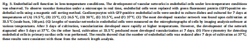 數(shù)據(jù):GFP標(biāo)記內(nèi)皮細(xì)胞顯示,33.5°C時(shí)血管網(wǎng)絡(luò)長(zhǎng)度最大(Fig. 3A-G);37°C培養(yǎng)5天后網(wǎng)絡(luò)停滯,而33.5°C持續(xù)發(fā)展至7天(Fig. 3G)。