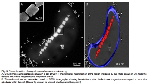 數據:磁鐵礦晶體形態因形態型異:螺旋菌為立方八面體(尺寸27.0-70.9 nm),球菌和弧菌為細長棱柱形(尺寸27.3-178.1 nm),桿菌為子彈形(尺寸45.9-114.2 nm);所有晶體為單域磁鐵礦。
