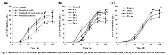 pH沖擊高效提升產量:單次NaOH沖擊(20 h, pH 8.0)是最優策略,Val-A增產27.43%。