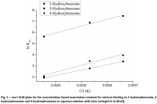 研究意義:2-異構(gòu)體結(jié)合最強(qiáng)歸因于螯合效應(yīng)(酚羥基與羧酸鹽協(xié)同),如Fig. 1所示;溫度升高降低K_ass,表明結(jié)合為放熱過(guò)程。這解釋了鈣對(duì)抗氧化活性的差異化影響。