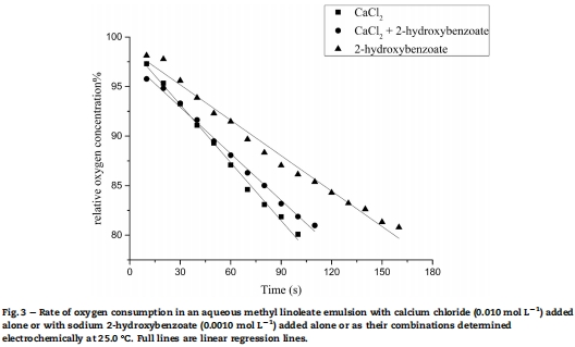 研究通過(guò)電化學(xué)方法測(cè)定了羥基苯甲酸酯與鈣的結(jié)合常數(shù)(K_ass),發(fā)現(xiàn)2-異構(gòu)體(水楊酸鹽)結(jié)合最強(qiáng)(K_ass = 280 mol/L),而3-和4-異構(gòu)體結(jié)合較弱(K_ass ≈ 7-8 mol/L)。熱力學(xué)參數(shù)顯示結(jié)合為放熱過(guò)程。在甲基亞油酸乳液氧化模型中,3-和4-異構(gòu)體抗氧化性優(yōu)于2-異構(gòu)體,但鈣的存在降低其抗氧化效率。電子自旋共振(ESR)顯示所有異構(gòu)體在Fenton反應(yīng)中促進(jìn)自由基形成,表現(xiàn)為促氧化。鈣水楊酸鹽溶解度低(K_sp = 4.49×10^-6)。研究表明食品中的鈣可通過(guò)絡(luò)合或沉淀降低植物酚的抗氧化活性。