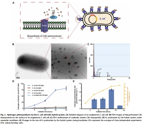 成功開發(fā)混合系統(tǒng):工程化大腸桿菌通過表面展示PbrR生物合成CdS納米顆粒,結(jié)合[NiFe]-氫酶,實現(xiàn)高效光催化產(chǎn)氫。