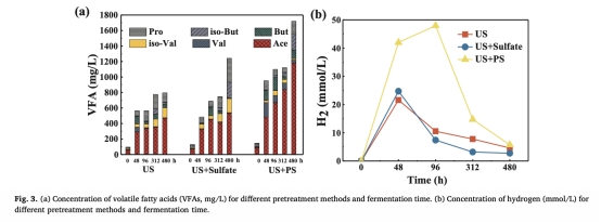 2 測量了揮發性脂肪酸和氫氣產量 during anaerobic fermentation,數據來自Fig.3a和Fig.3b。研究意義是驗證預處理對厭氧發酵的增強作用,顯示超聲與過硫酸鹽組合能顯著提高揮發性脂肪酸和氫氣產量,促進資源回收。