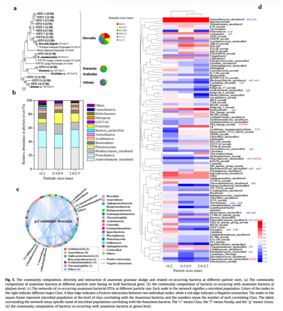 4 測量了微生物群落結構,通過高通量測序和網絡分析,數據來自Fig.5。研究意義是揭示厭氧氨氧化細菌多樣性及其與其它細菌的共生模式,表明最佳尺寸下多樣性最高,有助于群落穩定性。