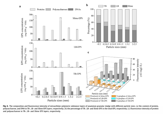 5 測量了胞外聚合物分層組成,包括蛋白質、多糖和DNA含量,數據來自Fig.6。研究意義是分析顆粒結構,表明緊密結合胞外聚合物層主導,多糖對維持結構重要,影響顆粒形成和穩定性。