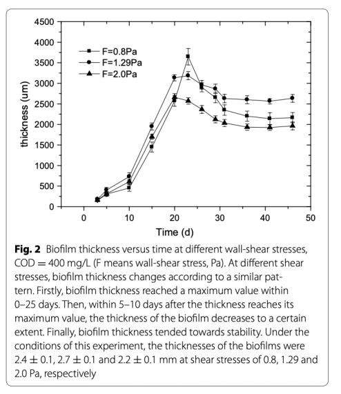 1 測量了生物膜厚度隨時間的變化,數據來自Fig. 2。研究意義是評估生物膜生長動態,顯示厚度先增后減至穩定,壁剪切應力影響厚度和密度,例如在1.29 Pa時厚度最大(2.7±0.1 mm),幫助理解生物膜結構形成。