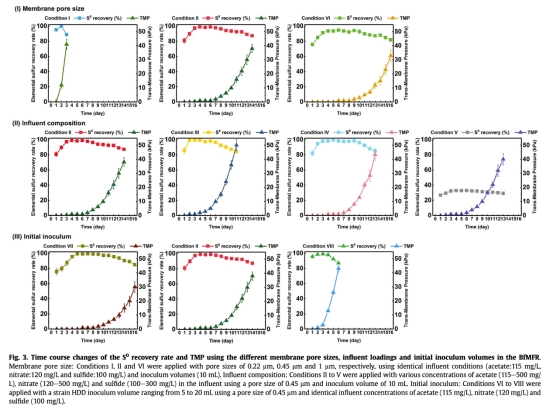 這篇論文研究了一種新型生物膜形成的膜過濾反應器(BfMFR)用于從含硫化物和硝酸鹽的廢水中回收元素硫(S0)。通過使用Thauera sp. strain HDD在膜表面形成生物膜,并利用膜過濾實時分離生成的S0,實現了高S0回收效率(平均98%)和高純度。反應器在進水硫化物、硝酸鹽和乙酸濃度分別為100、120和115 mg/L,膜孔徑0.45 μm,接種量10 mL(約2.4×10^7細胞)條件下穩定運行,硫化物負荷達62.5 kg/m3·d。S0回收純度高,幾乎不含微生物、胞外聚合物或無機雜質。該方法通過原位生成和及時分離S0,避免了硫循環(S2- to S0, S0 to SO4^2-, SO4^2- to HS-),為含硫廢水處理提供了可行方案。