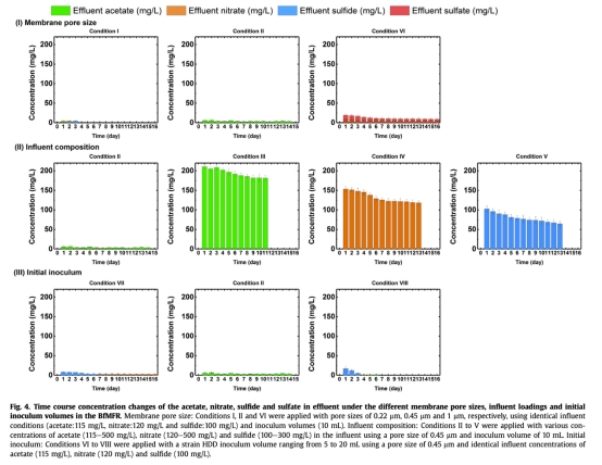 2 硫化物、硝酸鹽、乙酸濃度變化數據,來自圖4。研究意義是監控污染物去除效果,顯示BfMFR能同步去除多種污染物,硫化物和硝酸鹽去除率超95%,支持其在實際廢水處理中的應用潛力。