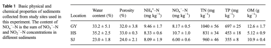1 沉積物基本物理化學(xué)性質(zhì)數(shù)據(jù),來(lái)自表1,包括水分含量、孔隙度、銨氮、硝態(tài)氮、總氮、總磷和有機(jī)質(zhì)含量。研究意義是表征沉積物環(huán)境背景,為解釋N2O轉(zhuǎn)化提供基礎(chǔ),顯示不同站點(diǎn)性質(zhì)差異影響氮循環(huán)。