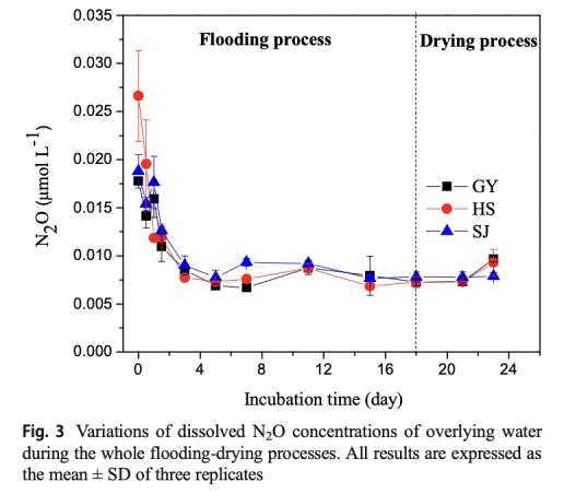 2 溶解N2O濃度變化數(shù)據(jù),來(lái)自圖3,顯示淹水初期N2O濃度快速下降50%,隨后穩(wěn)定。研究意義是直接捕捉N2O動(dòng)態(tài),表明淹水初期是關(guān)鍵排放期,指導(dǎo)重點(diǎn)關(guān)注初始階段。