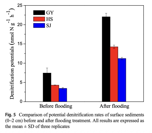 4 沉積物反硝化潛力數(shù)據(jù),來(lái)自圖5,顯示淹水后反硝化速率提高200%。研究意義是證實(shí)淹水促進(jìn)微生物活性,增強(qiáng)N2O產(chǎn)生能力,解釋排放峰值原因。