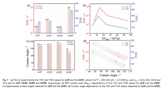 3 數據:氧氣演化曲線、初始氧氣演化速率(vi)與催化劑濃度(CRu)的關系、TOF和TON值,來自Fig.6和Fig.7。研究意義:氧氣傳感器監測實時氧氣濃度,動力學數據顯示準一級反應,支持WNA機制;TOF和TON比較催化性能,表明CCP3最優,界面潤濕性(接觸角)是關鍵因素。