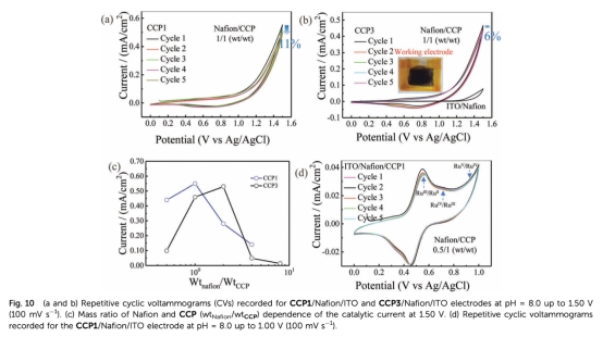 5 數據:循環伏安圖(CVs)、電催化電流,來自Fig.10。研究意義:電化學測試顯示催化劑在電極上的活性和穩定性,CCP/Nafion/ITO電極在多次循環后保持活性,證明其適合電催化應用。