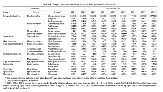 4 數(shù)據(jù):微生物群落組成在門和綱水平分布,來自Fig.6和Table 4。研究意義:Fig.6展示不同DO下群落相對豐度,好氧層Betaproteobacteria占主導(dǎo),厭氧層Anaerolineae增多,Table 4列出屬水平細(xì)節(jié)(如Uliginosibacterium豐度最高),證實(shí)DO驅(qū)動(dòng)群落演替,影響系統(tǒng)穩(wěn)定性。