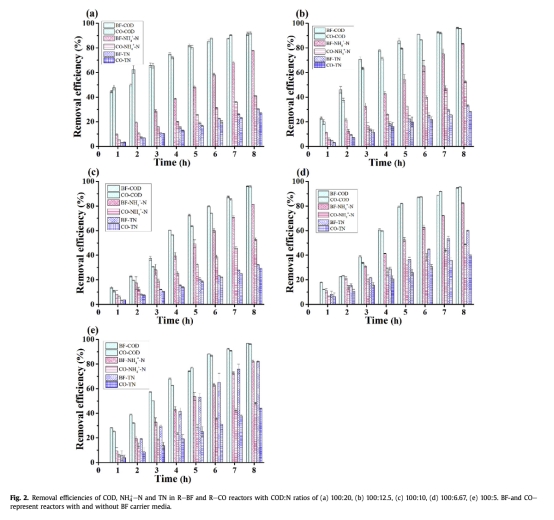 1 數(shù)據(jù):COD、NH4-N和TN的去除效率,來自Fig.2。研究意義:這些數(shù)據(jù)顯示R-BF反應(yīng)器在所有COD:N比下均能高效去除COD(超90%),且氮去除率顯著高于R-CO反應(yīng)器(最高TN去除率82.07%),證明BF載體能增強同步硝化反硝化能力,為廢水處理提供更高效的生物膜系統(tǒng)。