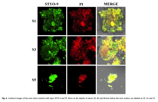 3 數(shù)據(jù):細菌活性通過Live/Dead染色的共聚焦圖像,來自Fig.4。研究意義:圖像顯示即使在60mm深度也有活細菌分布,表明生物巢在深層仍保持生物活性,這證實了BF載體能支持厚生物膜的可持續(xù)性,對廢水處理中的生物量保留和效率提升至關(guān)重要。