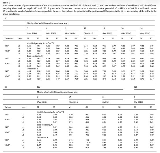 摘要描述了墓穴土壤因常見挖掘和回填實踐導致土壤結構破壞,影響氣體和水分傳輸功能,可能導致分解問題,如氧氣不足。研究測試了生石灰(CaO)應用作為結構改良方法,以改善墓穴土壤的通氣性。通過在德國三個不同質地地點(沙壤土、粉壤土、粘壤土)設置墓穴模擬(無尸體),比較添加生石灰和不添加的處理,測量擴散性和孔隙功能參數,并進行現場監測。結果表明,生石灰應用提高了擴散性和氧氣濃度,但效果受粘土含量和土壤水分影響。