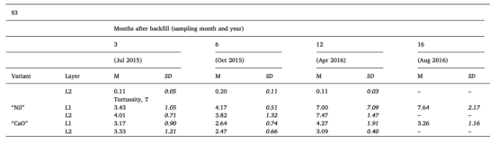 2 孔隙特性:包括空氣填充孔隙度(θa)、孔隙連續性指數(C1)和曲折度(T),在標準基質勢(-6 kPa)下測量。數據來自Table 2。研究意義是揭示生石灰如何影響孔隙的連通性和結構穩定性,為理解土壤物理性質變化提供依據。