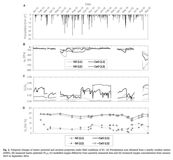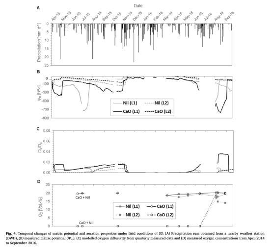 3 現場監測數據:包括基質勢(Ψm)和氧氣濃度,定期測量。數據來自Fig.2、Fig.3和Fig.4。研究意義是評估實際田間條件下生石灰的效果,考慮水分動態對通氣性的影響。
