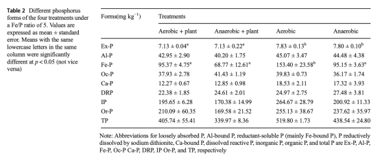 2 磷形態(tài)數(shù)據(jù):來自表2和表3,包括松散吸附磷、鋁結(jié)合磷、鐵結(jié)合磷、閉蓄態(tài)磷、鈣結(jié)合磷、溶解性活性磷、無機(jī)磷和有機(jī)磷含量。研究意義是鐵結(jié)合磷比例高(約45%)表明濕地內(nèi)部磷負(fù)荷大,鐵添加在好氧條件下抑制磷釋放,為控制富營養(yǎng)化提供依據(jù)。