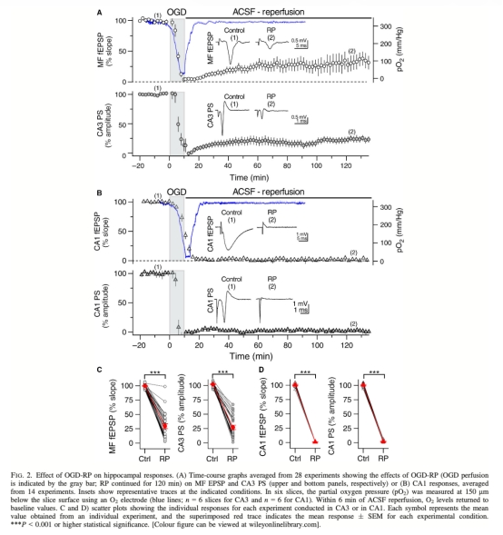 4 數據:氧氣分壓測量顯示OGD期間pO2下降85%,再灌注后恢復。研究意義:驗證OGD模型的有效性,確保氧氣剝奪與電生理和生化變化關聯。來源:圖2。