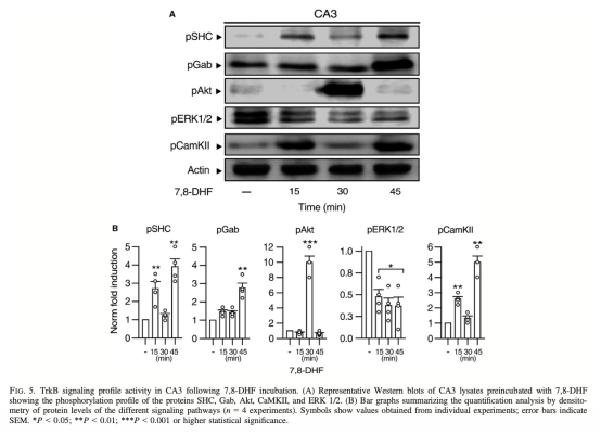 2 數據:Western blot顯示OGD增加pTrkB和pAkt水平,BDNF或7,8-DHF增強磷酸化,ANA-12抑制。研究意義:證明TrkB激活PI-3-K/Akt通路,此通路與細胞生存相關。來源:圖3、5。
