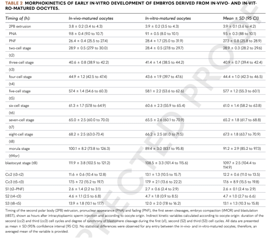 4. 形態(tài)動(dòng)力學(xué)參數(shù):如第二極體擠出時(shí)間、原核出現(xiàn)和消失時(shí)間、卵裂時(shí)間等,兩組無(wú)顯著差異,數(shù)據(jù)來(lái)自Table 2。研究意義是表明體外成熟卵母細(xì)胞胚胎發(fā)育時(shí)序正常,反映胚胎質(zhì)量。