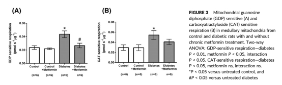 摘要部分闡述了研究目的是檢驗(yàn)二甲雙胍對(duì)胰島素缺乏糖尿病動(dòng)物模型腎臟氧代謝和線粒體功能的影響,以分離其腎臟保護(hù)作用與血糖穩(wěn)態(tài)的影響。方法包括給大鼠注射鏈脲佐菌素(STZ)誘導(dǎo)糖尿病,并給予二甲雙胍治療。在體測(cè)量腎功能和腎內(nèi)氧張力,體外分離線粒體進(jìn)行呼吸測(cè)量和超氧化物評(píng)估。結(jié)果發(fā)現(xiàn)二甲雙胍改善了髓質(zhì)組織氧張力,而不影響血糖穩(wěn)態(tài);減少了UCP2依賴的LEAK呼吸,并差異性地影響線粒體超氧化物產(chǎn)生。結(jié)論是二甲雙胍減輕糖尿病誘導(dǎo)的腎髓質(zhì)缺氧,機(jī)制獨(dú)立于血糖穩(wěn)態(tài),涉及減少UCP2介導(dǎo)的線粒體質(zhì)子LEAK。
