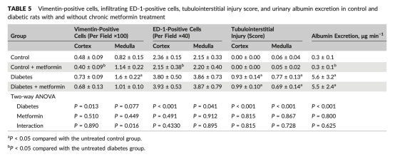6. 組織學(xué)損傷和炎癥細(xì)胞浸潤(rùn) [來自表5] - 研究意義是評(píng)估糖尿病腎病的結(jié)構(gòu)性改變,二甲雙胍未顯著改善損傷評(píng)分或 albuminuria,表明短期治療可能主要影響功能而非結(jié)構(gòu)。