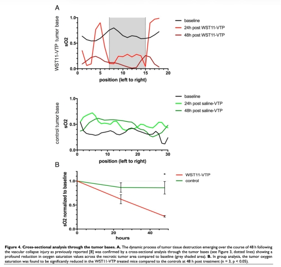 3. 數據:組織學數據,顯示WST11-VTP組在48小時后出現中央腫瘤壞死,而對照組僅有限壞死。這些數據來自圖3和圖4。研究意義:這驗證了SO2變化與腫瘤破壞的相關性,支持MSOT作為生物標志物監測工具的可靠性。