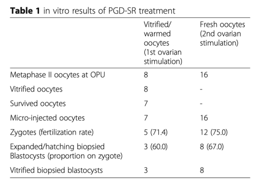 2 體外培養(yǎng)數(shù)據(jù):從表1中,凍存卵子存活率7/8,受精率71.4%,囊胚形成率60%;新鮮卵子受精率75%,囊胚形成率67%。研究意義是證明凍存和新鮮卵子均可用于PGD-SR,囊胚活檢成功率較高,支持臨床可行性。
