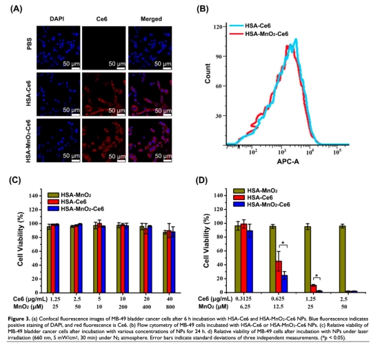 4 來自圖3c和3d:細胞活力實驗顯示,NPs本身無毒性,但在激光照射下,HSA-MnO2-Ce6 NPs比HSA-Ce6 NPs更能降低膀胱癌細胞活力。研究意義是證明NPs通過改善缺氧增強了PDT的細胞殺傷作用,且安全性高。