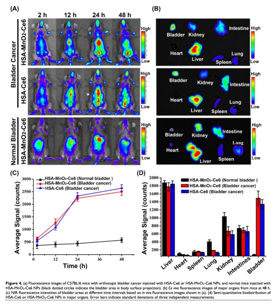 摘要部分闡述了光動力治療(PDT)是一種新興的癌癥治療方法,但腫瘤缺氧限制了其在膀胱癌治療中的應用。為了解決這一問題,研究制備了產氧的HSA-MnO2-Ce6 NPs(人血清 albumin 包覆的MnO2納米顆粒結合氯in e6),以克服腫瘤缺氧并增強PDT效果。方法包括NPs的制備、體外和體內氧氣生成測試、原位膀胱癌模型建立、雙模態成像展示以及治療效果評估。結果顯示,NPs在體外與內源性H2O2反應時能高效生成氧氣,在660 nm激光照射下,使用HSA-MnO2-Ce6 NPs比HSA-Ce6 NPs的singlet氧生成增加兩倍。體外細胞活力實驗表明NPs本身無毒,但能顯著增強PDT對膀胱癌細胞的殺傷效果。體內近紅外熒光和磁共振成像顯示NPs具有良好的膀胱腫瘤靶向性,注射NPs后原位膀胱癌的氧氣含量增加3.5倍。基于優異的腫瘤靶向性和低毒性,NPs用于PDT治療原位膀胱癌,顯示出顯著改善的治療效果和小鼠生存期延長。結論是HSA-MnO2-Ce6 NPs在膀胱癌光動力消融中具有巨大潛力,并提供了一種克服腫瘤缺氧的新治療策略。